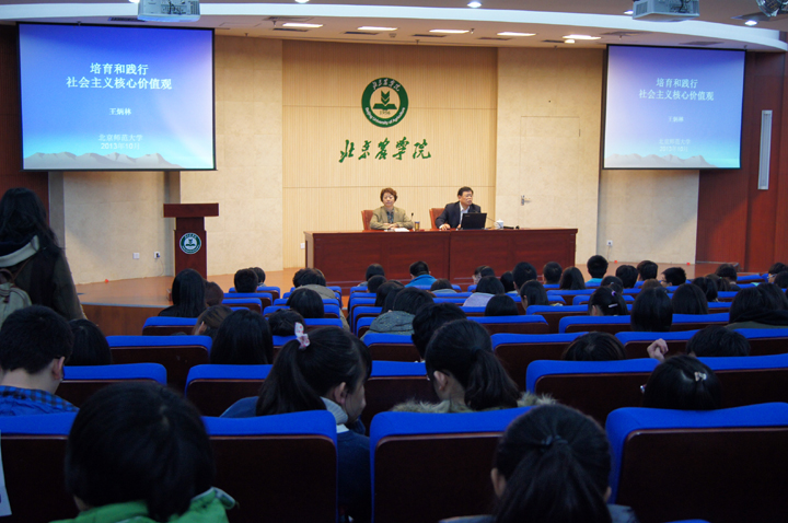 受思政部邀请,11月5日(周二)下午2:00,学校客座教授、北京师范大学党委副书记、博士生导师王炳林在图书馆报告厅为我校师生举行“培育和践行社会主义核心价值观”专题报告会,报告会由校党委副书记高东主持。