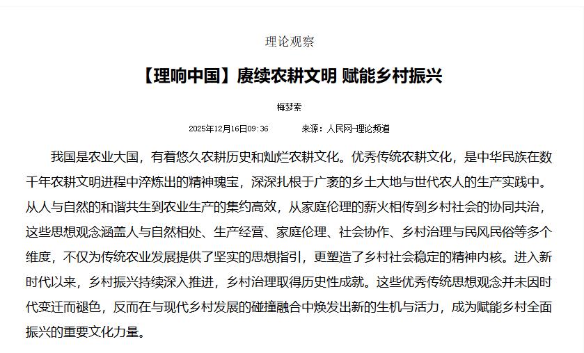 12月16日,tyc522cc太阳成集团教师梅梦索老师撰写的文章《赓续农耕文明 赋能乡村振兴》在人民网理论频道刊发。