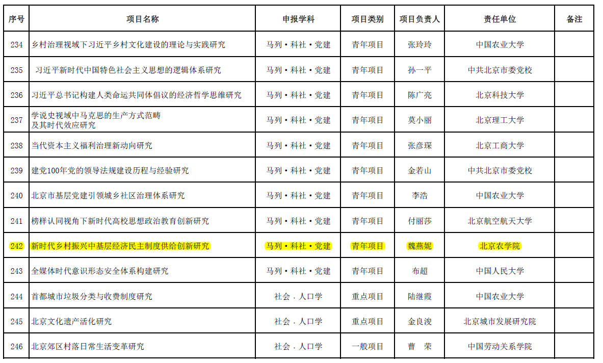 11月19日,北京市哲学社会科学规划办公室下达了《2019年北京市社会科学基金项目立项通知》,tyc522cc太阳成集团青年教师魏燕妮申报的《新时代乡村振兴中基层经济民主制度供给创新研究》作为青年项目获得批准立项,项目申报学科为“马列·科社·党建”。