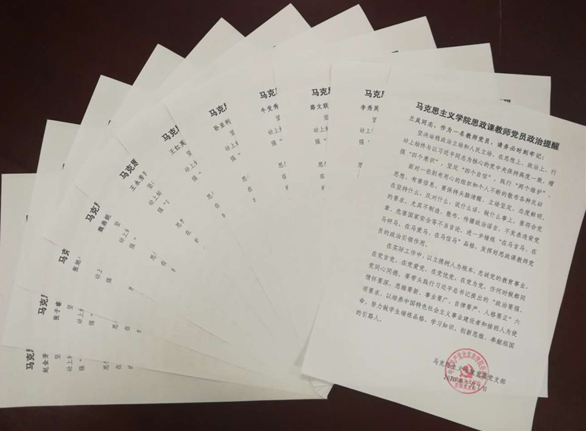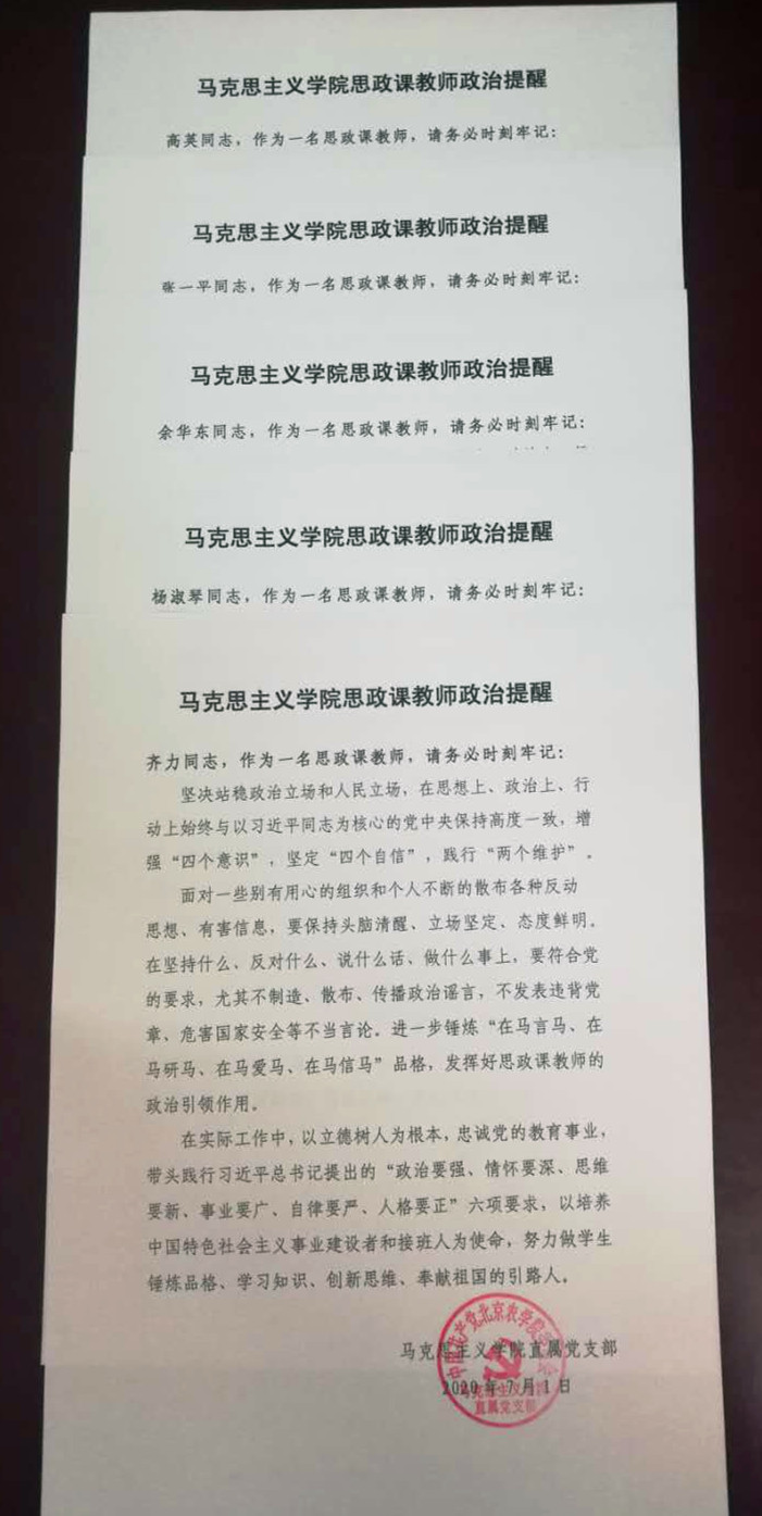 为了庆祝建党99周年,按照学校党委部署和要求,7月1日,tyc522cc太阳成集团直属党支部对学院党员干部和思政课教师开展整治提醒。结合党委要求和思政课教师实际,学院分别为党员领导干部、思政课党员教师、思政课非中共党员教师制定了不同的政治提醒内容和具体要求。